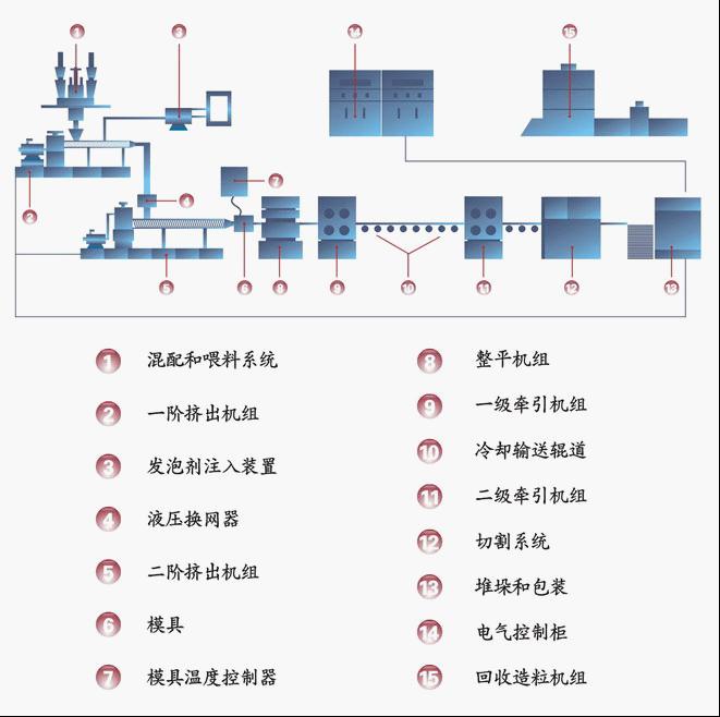 XPS發(fā)泡板材生產線使用的主要原料是全新或回收的聚苯乙烯(PS)顆粒,通常需要加入色母?;蜃枞紕┑忍砑觿?,把混配后的原料喂到一階擠出機組進行熔融塑化并攪拌,持續(xù)注入發(fā)泡劑(如氟里昂、丁烷和二氧化碳CO2等)并快速混煉加壓,然后擠出通過液壓換網器,把流體聚合物中的雜質過濾出來,接著混合物被推送到二階擠出機組,進一步地充分混合并降溫,在此階段對聚合物的溫度和壓力進行控制,而后被擠出有特定流道的模具,此時混在聚合物中保持高壓的發(fā)泡劑在瞬間壓力釋放,發(fā)泡劑氣化形成很多各自獨立的微小氣泡,被包裹在聚苯乙烯膜泡內,經冷卻定型形成截面均勻、閉孔蜂窩狀的板材,接著是整平機組和牽引輸送輥道,然后經過切割系統(tǒng)得到預定尺寸的XPS擠塑板,后是堆垛和包裝入庫。邊角廢料通過回收造粒機得到循環(huán)利用。一般情況下,XPS板材還要經過開槽、表面打毛或銑邊成型等處理以滿足不同的應用。