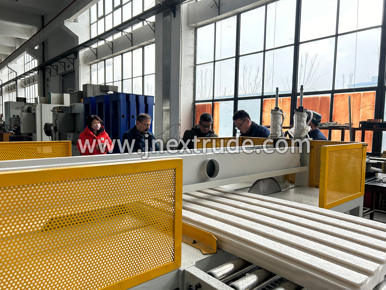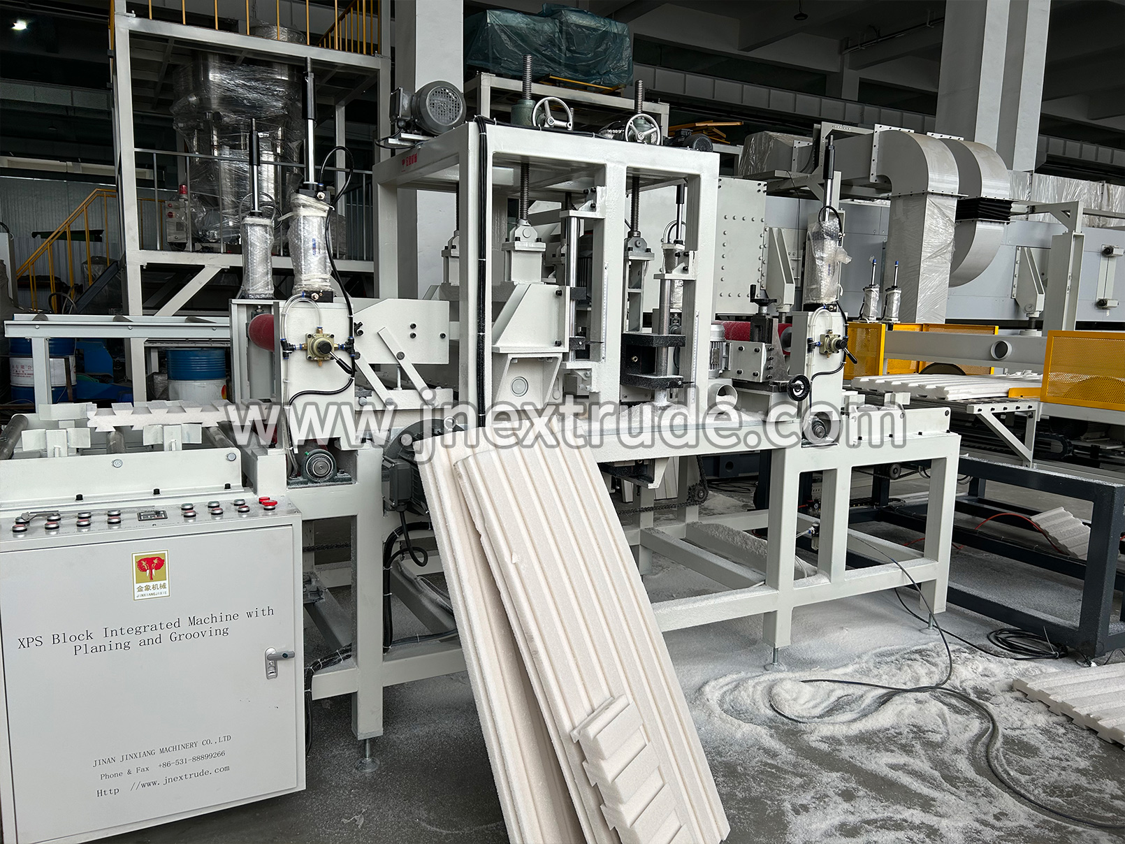 表面拉毛開槽機組采用機架、組合式合金刀頭、電機、氣壓裝置、滾輪適用于采用螺旋刀組將擠塑板表面去皮打毛,獲得所需要的表面結(jié)構(gòu)以確保板材的墻面附著力。利用高速旋轉(zhuǎn)鋸片在板材表面打磨出具有一定深度和寬度的雨槽,以增加其表面黏結(jié)性能。